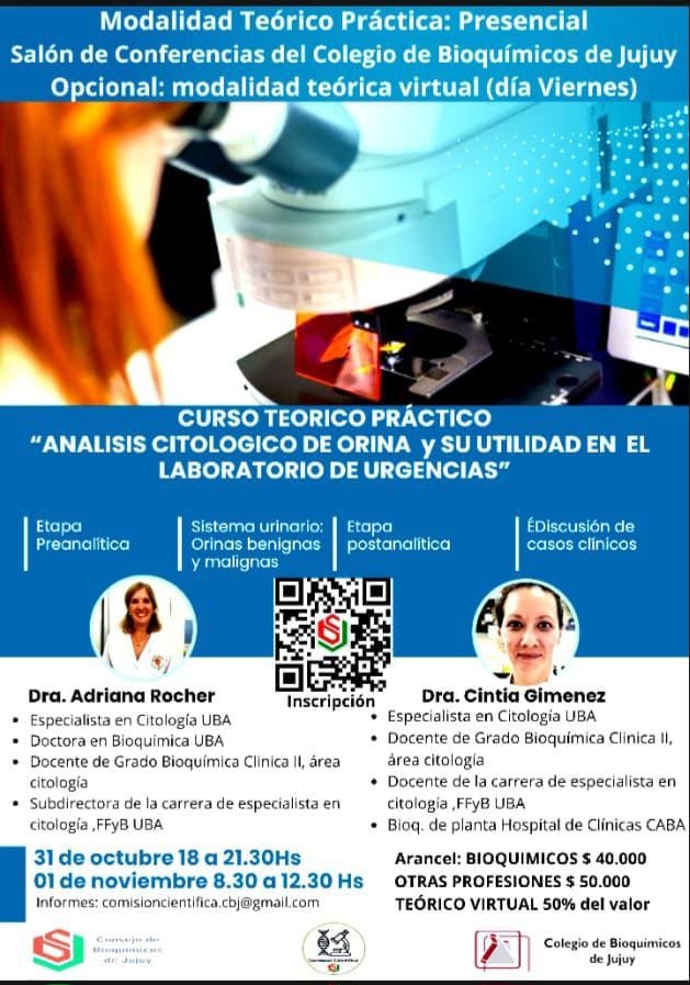 - Modalidad: teoría virtual + presencial (Ramírez de Velazco 212, San Salvador de Jujuy – Colegio Bioquímico de Jujuy)